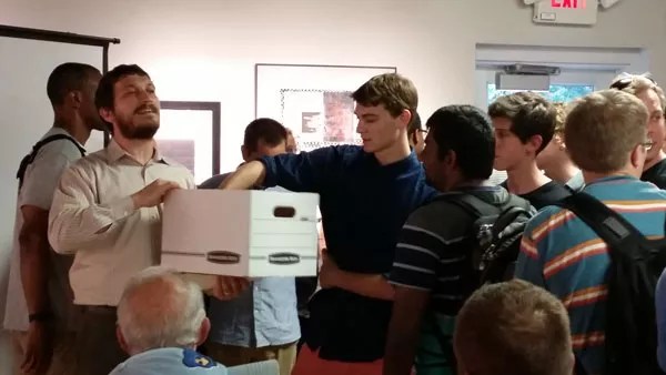 A young man wearing a multi-colored striped shirt with a book bag strapped to his back waits in line. He says a quick prayer before sticking his arm into a white cardboard box and pulling out a strip of white paper. His eyes dart over the writing. “Drama.” He reads off the word and exhales a breath of relief.