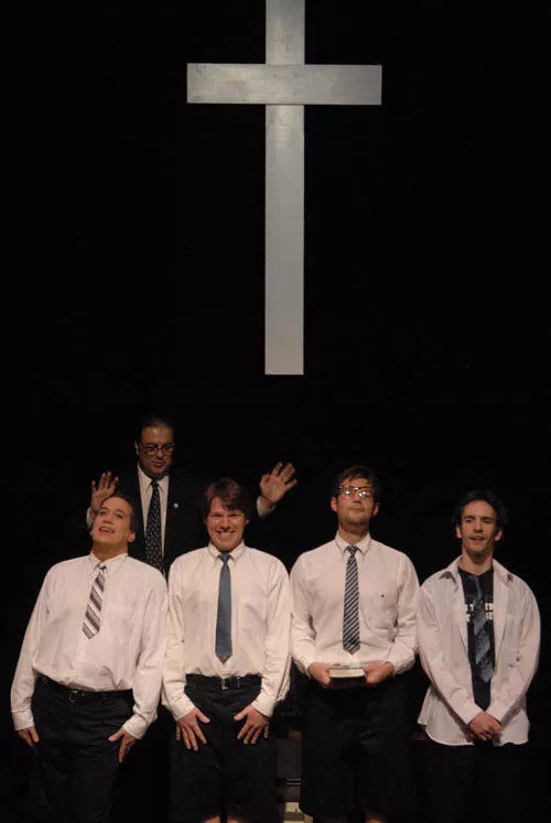 Not to worry, there are plenty of the comedic and satirical jolts we expect from Shores and Queen City Theatre along the way. At the center of the story are the four title characters who stray from the fold — or at least entertain the idea. T.J. Brooks is the least likely of the four boys to renounce the church, fighting himself as he quotes chapter and verse from Scripture. On the other hand, Benny’s gayness flames so fiercely that we’re not altogether surprised at his transformation into diva transvestite Iona Traylor. Andrew Thomas Ford is far more ambivalent about his sexuality, frequenting a drag gay nightclub and praying to God to cure his affliction.