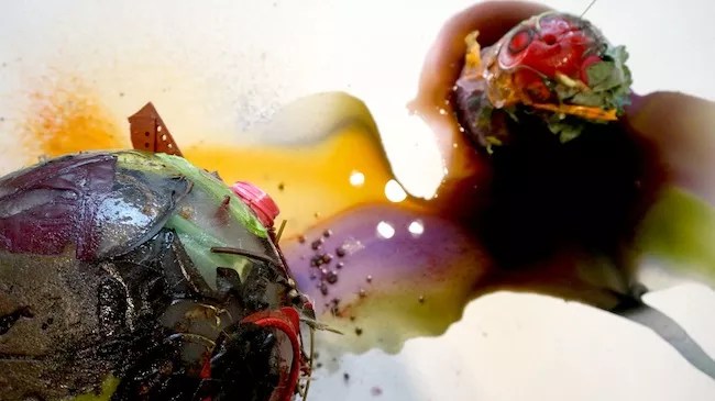 She reveals that she’s currently eating all the frozen food in her freezer to make way for art. Using a container similar to a salad bowl, she creates half a sphere. She fills the bowl with trash, natural debris and pigment, fills the bowl with water and pops it in the freezer.