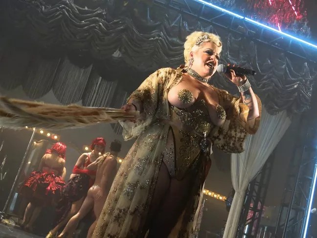 There were orgiastic ensembles complete with simulated copulation, an artsy pole dance, an S&M-lesbian episode, a cross-dressing stag party and a kick line of man-poodles. There were also lyrical moments, particularly when Marcy Richardson soared above us into star-studded blackness on an aerial hoop, singing an operatic arrangement of Sia’s “Chandelier.” There may be a few messages from Cirque du Soleil on Richardson’s voicemail. Vegas beckons!