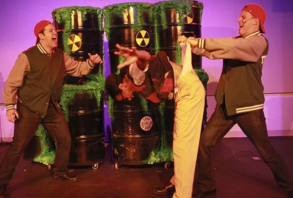Whether by accident or design, then, Decker doesn’t make the mistake that plagued the off-Broadway show: overproduction. In the New York version, when Melvin emerged from the chemical dumpsite as Toxie, the green carbuncled mask that covered his head was not only horrific, it robbed actor Nick Cordero of all further facial expression.