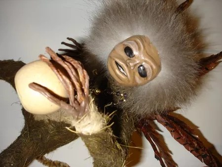 This piece is made from carved styrofoam, paper, wire, clay, and fur.