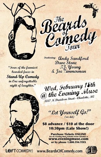 Check out the flyer (below) for details on The Beards of Comedy Tour, which goes down tomorrow (Wed., Feb. 18) at the Evening Muse.