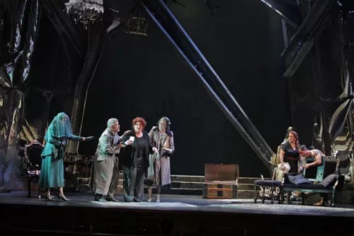 The Medium – Taking complete control over set and costume design, director John Pascoe has transported Gian Carlo Menotti’s most successful opera to a surreal, post-WW2 setting that resonates wonderfully with the spiritualism and guilt that haunt the composer’s libretto and score. The ceiling is so high and the doorway so wide that Madame Flora’s séance parlor might as well be a warehouse taken over by Gypsy squatters. When that doorway opens, bombed out shells of buildings, a la Dresden, form the cityscape.