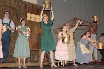 “Simple Little Things,” Lizzie’s anthem, and the ensemble’s “Rain Song” come the closest to measuring up to the classic scores of the 40s, 50s, and 60s. But all of the Schmidt-Jones songs in 110 are listenable and serviceable, and the wee John Stafford-led orchestra handles them well. Better yet, Old Courthouse outdoes CPCC in delivering a truly wet ending.