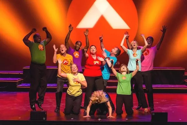 Electronics worked sleekly throughout the evening, though the wit on the big screens flanking the stage often had me in a quandary about where to look. If there’s an outbreak of laughter in the audience over what just went up on a screen, there ought to be enough time for those of us watching the stage to catch up. Do not even attempt to watch this show from the first two rows if you’re wearing a neck brace. (If you aren’t, you might need one afterwards.)