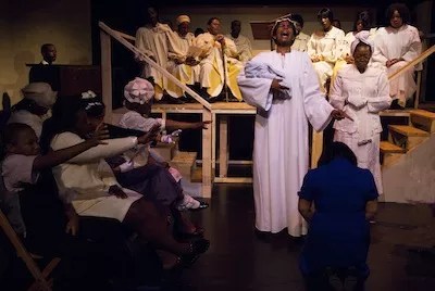 Plenty of amens can be heard in the opening scene at a corner Pentacostal Church, as playwright James Baldwin signals to us that he’s no less interested in immersing us in the spirit of this church’s worship than he is in telling the story of its anointed pastor, Sister Margaret. I had fully anticipated a baptism of amens as soon as I saw that half the stage in Nathanial Rorie’s aptly rickety set design had been devoted to the choir loft and pulpit, with ample space provided downstage for the congregation and meetings of the church elders. What surprised me was that there was no respite from the shower of amens when we adjourned to Sister Margaret’s kitchen. That’s where we learn about her domestic crises, past and present, and the oncoming turmoil in her church, where she will be called to battle if she wishes to maintain her leadership.