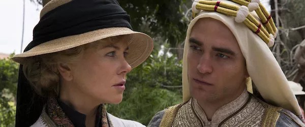 QUEEN OF THE DESERT (2017). With so many classics to his name, the legendary German filmmaker Werner Herzog need not apologize for helming Queen of the Desert — it’s just shocking that his name is attached to something as arid and uninspired as this stillborn drama. Gertrude Bell led an extraordinary life as an archaeologist, as a writer, as a traveler, as a political liaison, and as a lover of the Middle East during a period of great change and upheaval. All of this is touched upon in Queen of the Desert, yet Herzog (who both wrote and directed) seems more interested in tracking her comparatively commonplace affairs with men who hardly seem worthy of her. As her first lover, a low-level embassy employee stationed in Tehran, James Franco is simply terrible, remembering to add a British accent once every 400 words and looking downright constipated during his amorous clinches with Gertrude. As her second lover, a married Army officer, Damien Lewis is more adequately cast, even though he and Kidman strike few sparks. Her best rapport occurs in scenes opposite Robert Pattinson, who appears as adventurer T.E. Lawrence (of Arabia fame) – while it’s impossible to accept him (or anybody) in the role after Peter O’Toole, he at least presents a reasonably compelling figure worthy of Gertrude’s time. As for Kidman, she’s suitably spirited in the role, though it takes plenty of gulping swallows to accept her as a 24-year-old in the early sequences.