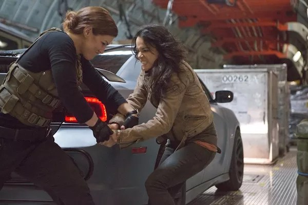 The size of the cast already seems to rival that of any daytime TV soap opera, but director Justin Lin and writer Chris Morgan (both series vets) add yet another principal character: Agent Riley, a law enforcement officer played by Haywire lead Gina Carano. The addition of Carano, a former mixed martial arts superstar, guarantees that not all of the action will be conducted behind the wheel, and the film delivers on this promise by showcasing not one but two mano-a-mano bouts between Letty and Riley. These up-close-and-personal skirmishes nicely complement the road-warrior set-pieces, the biggest of which centers on a tank smashing, well, everything in its path.