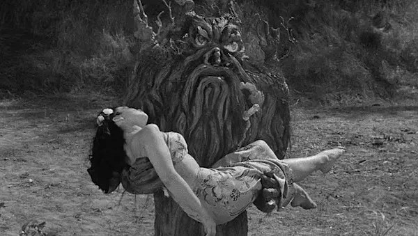 FROM HELL IT CAME (1957). “And to Hell it can go,” wrote Ed Naha in Horrors – From Screen to Scream. “As walking-tree movies go, this is at the top of the list,” opined Leonard Maltin in his annual Movie Guide. “Wooden acting,” noted John Stanley in Creature Features. “To Hell with it,” huffed Steven H. Scheuer in Movies on TV. Clearly, there’s something about From Hell It Came that brings out the joker in all of us. Then again, that’s probably the right approach when taking an ax to a film that’s almost entirely sunk by its monster, long established as one of the most ridiculous in film history. Unfolding on a South Seas island, the plot is uninspired but workable: Betrayed by his tribe’s witch doctor, the new chief, and even his own wife, a prince is executed by having a dagger driven through his heart. Before he dies, he swears vengeance on his tormentors, a plan made easier by all the radiation blowing in the wind thanks to nearby nuclear testing. The radiation is what allows him to return to life in the form of a walking tree, but not before American scientists stationed on the island notice him initially sticking like a stump out of the burial site and take samples of his green blood. It’s hard to get angry at a movie like From Hell It Came because it seeks only to entertain – and it does, albeit not in the ways that were intended. The Americans make some bad jokes, a man-hungry widow (American actress Linda Watkins, going overboard with a British accent) babbles incessantly, and the angry tree slooooowly walks across the terrain, somehow catching and killing people.