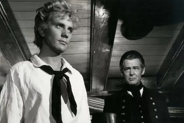 BILLY BUDD (1962). Fans of nautical adventures will find much to appreciate in Billy Budd โ even if (especially since?) it appeared on the scene long before Johnny Depp and his now-stale shtick. Adapted from the Herman Melville novel Billy Budd, Sailor (published decades after the authorโs death) and set at the end of the 18th century, this stars Terence Stamp as the title character, an honest and naรฏve sailor whose genuine decency affects everyone around him in a positive manner. Make that almost everyone โ the exception is John Claggart (Robert Ryan), the shipโs sadistic master of arms and a bully who feels threatened by Billyโs seemingly indomitable goodness. Caught in the middle is Edwin Fairfax Vere (Peter Ustinov), the vessel’s captain and a fundamentally moral man whose dedication to the law leads to disastrous results. Ustinov was a popular actor for 60 years (Oscars for Spartacus and Topkapi) and an acclaimed scripter for 50, yet he also helmed a smattering of films over a 40-year stretch โ this one is arguably the best of that directorial batch, with forceful performances (look for a young David McCallum, one year before The Great Escape and two years before The Man from U.N.C.L.E.) and a script (credited to Ustinov and Cat People screenwriter DeWitt Bodeen) that thoughtfully examines the dangers of placing the letter of the law over true justice (a relevant theme in this age of the impeachable Trump and his rampant corruptibility). Ryan is, as always, superb, while Stamp earned a Best Supporting Actor Oscar nomination for his beatific turn.