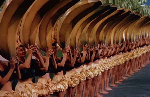 THE GANG’S ALL HERE (1943). Whether one views The Gang’s All Here as a kitschy, campy spectacle or merely another splashy musical from the Dream Factory largely depends on one’s tolerance for garish colors, kaleidoscopic set-pieces and the sight of Carmen Miranda and her juicy fruits. Director and choreography Busby Berkeley’s first color musical finds a cocksure soldier (James Ellison) falling for a showgirl (Alice Faye), but never mind the wafer-thin plot. Instead, enjoy the musical numbers (Leo Robin and Harry Warren contribute such tunes as “Minnie’s in the Money,” “The Polka Dot Polka” and “The Lady in the Tutti Frutti Hat,” while Benny Goodman pops up for some swinging and singing), chuckle at the antics of vets Eugene Pallette, Charlotte Greenwood and my favorite filmic fussbudget, Edward Everett Horton, and marvel at the sights presented by Berkeley, including the all-singing, all-floating heads, the strawberry fields forever, and those gigantic, phallic bananas rising and falling on cue. This deservedly nabbed an Oscar nomination for Best Art Direction & Interior Decoration.