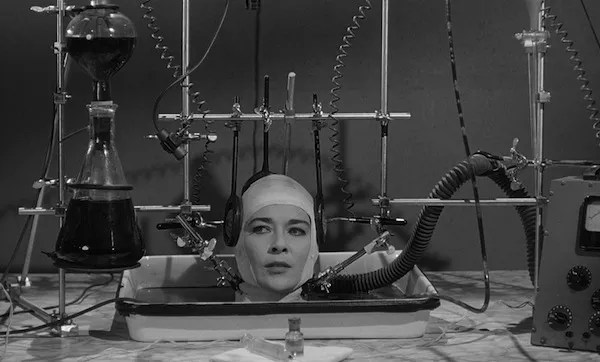 THE BRAIN THAT WOULDN’T DIE (1962). One of those so-bad-it’s-good-to-experience-at-least-once-in-a-lifetime efforts, this grade-Z cheapie is pretty wretched yet deserves extra credit for being so brazenly bizarre. Dr. Bill Cortner (Herb Evers) is the film’s resident mad scientist, with a simpering assistant (Leslie Daniel) at his side and a man-made monster (7-foot, 3-inch tall Eddie Carmel) locked in the closet. After Bill’s fiancée Jan (Virginia Leith) gets decapitated in a car accident, he manages to save the head by placing it in a dish and attaching various tubes to it. Ignoring Jan’s pleas to let her die, Bill instead plans to make her whole again by attaching her head to a voluptuous body. So with murder — and mammaries — on the mind, off he goes to ogle various strippers and models, leaving Jan behind in the lab to develop a telepathic relationship with the grotesquerie in the closet. Frequently making the rounds in an edited version, this new release from Shout! Factory offers the film uncut, thus allowing viewers to enjoy some additional gore and revel in the film’s unrepentant sleaziness a bit longer.