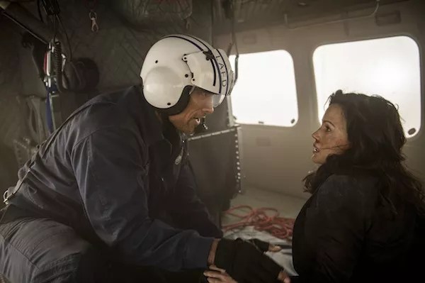 San Andreas, which basically pits The Rock against tons of rocks, offers the common theme of personal problems set against a massive backdrop. And while Bogart’s Rick Blaine in Casablanca opined that “it doesn’t take much to see that the problems of three little people don’t amount to a hill of beans in this crazy world,” in the disaster genre, the problems of the little people are paramount. In the case of San Andreas, the three would be Ray (Dwayne Johnson), an LA-based search-and-rescue helicopter pilot, his wife Emma (Carla Gugino), whose inability to crack her husband’s defenses following a past tragedy has left her no choice but to file for divorce, and their daughter Blake (Alexandra Daddario), whose inner decency matches her outward beauty.