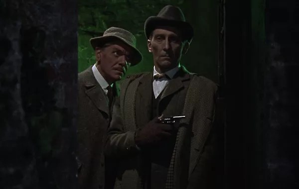 THE HOUND OF THE BASKERVILLES (1959). Of the countless film and television versions of the venerable Sherlock Holmes tale penned by Sir Arthur Conan Doyle — a story that’s been interpreted by various actors from Basil to Benedict — the worst would have to be the atrocious, practically unwatchable 1978 spoof starring Peter Cook as Holmes and Dudley Moore as Dr. Watson. And the best? For that, look no further than this handsome and exciting adaptation from the same studio (Hammer), director (Terence Fisher) and stars (Peter Cushing and Christopher Lee) that had all exploded onto the international scene with 1957’s The Curse of Frankenstein and 1958’s Horror of Dracula (and would soon reunite for The Mummy later in ’59). The film opens with the arrogant and entitled Sir Hugo Baskerville (David Oxley), the Brock Turner of his time, engaging in rape and other crimes, activities that lead to a curse forming around his family name. The curse manifests itself well down the line, when it leads to the death of Sir Charles Baskerville and threatens to also visit the new heir, Sir Henry Baskerville (Lee). Enter the intrepid Sherlock Holmes (Cushing) and his faithful sidekick Dr. Watson (Andre Morell), both doing their damnedest to make sure Sir Henry stays alive. Cushing is splendid as Holmes — perhaps less eccentric than other screen Holmes but certainly no less committed — while it’s nice to see Lee in a rare good-guy role. Fisher would later helm another Sherlock flick, 1962’s Sherlock Holmes and the Deadly Necklace — this time, Lee would have the honor of playing the brilliant sleuth.
