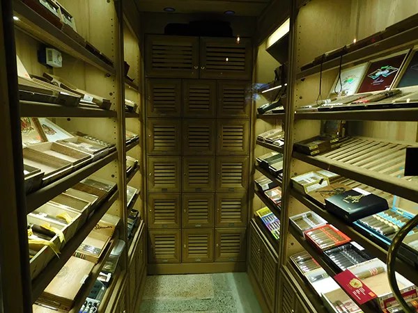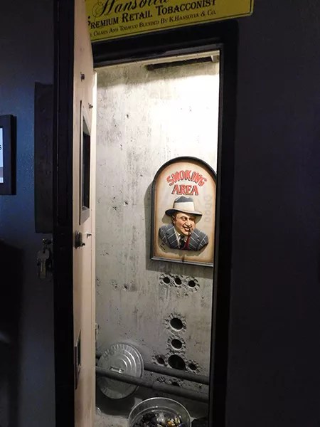 The second floor, originally a row of cells and a shower for inmates, has been converted into the cigar lounge. It’s a dark room with glass walls partitioning off the area from other patrons. The shower fixtures are still visible on any given night if you look up into the haze of smoky leisure.