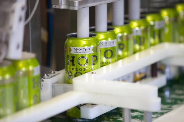Cans of Hop DropN Roll come fresh off the canning line at Noda Brewing Company. (Photo by Jeff Hahne)