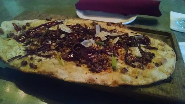 Two things Iโm not ยญโ Creative Loafingโs food or cocktail critic. Letโs just say I was completely impressed with my duck flatbread, and the wall of liquor is awe-ยญinspiring. Iโll make it a point to return for their famous brunch and a libation. For now, Iโm here for the beer.Tonightโs beer menu lists eight options, two of which I learned have sadly gone offยญtap earlier today. Offerings skew to Farmhouse-ยญstyle ales, with four of the listed falling into that category. A fifth, an American stout base, even gets the farmhouse ale yeast treatment.