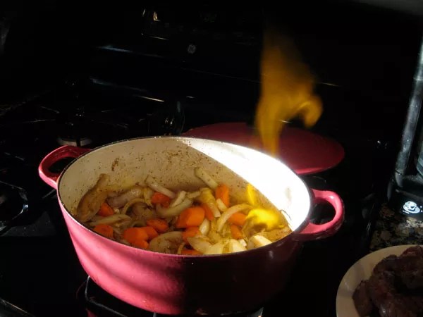 Ok, so no major warning with this besides just “stand back” is stated. Then it can’t be that hazardous, no big deal, right? Well, I used a long Bic lighter to ignite the Cognac and what resulted was flames shooting 1 foot out of the Dutch oven. Um … ok, this will die down soon I told myself. Just like the showy bananas flambe the chef made on the cruise, no?