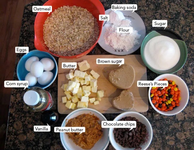 With the entire recipe only containing 1/2 cup of flour, these cookies consist mainly of a lot of oatmeal and peanut butter, with some tidbit goodies like chocolate chips and Reese’s Pieces mixed in. Mmmmm. Party in my mouth.