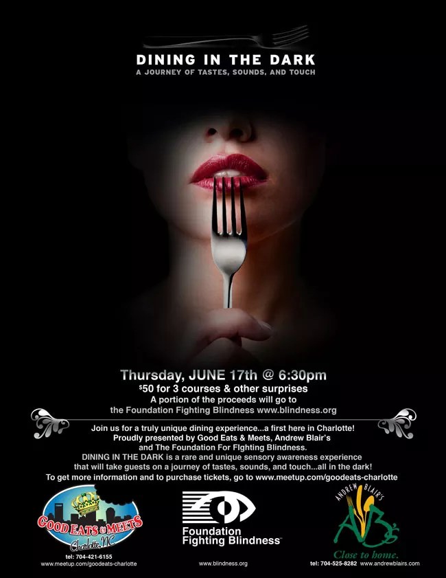 The Charlotte Good Eats and Meets group has arranged a Dining in the Dark experience at Andrew Blair’s on June 17. For $50, the dinner will include 3 courses and a few “surprises.” The menu will be be kept under wraps until the dinner. (Beware if you have any food allergies.) A portion of the proceeds will go to the Foundation Fighting Blindness.