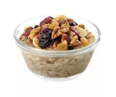 No pasty, goopy oatmeal here CFA’s oatmeal is made of a mixture of steel-cut oats, rolled oats, flax, buckwheat flour and whole wheat flour. You can choose one of three toppings, including cinnamon brown sugar, roasted mixed nuts (almonds, pecans and walnuts) or a dried fruit blend (cranberries, blueberries, golden raisins and cherries).