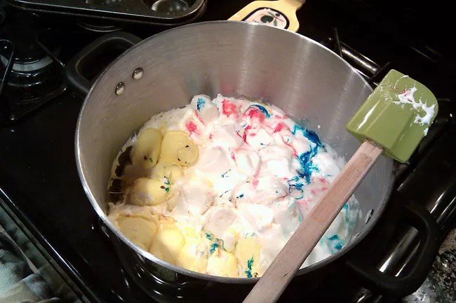 1. In large saucepan melt butter over low heat. Add Peeps and stir until completely melted. Remove from heat.