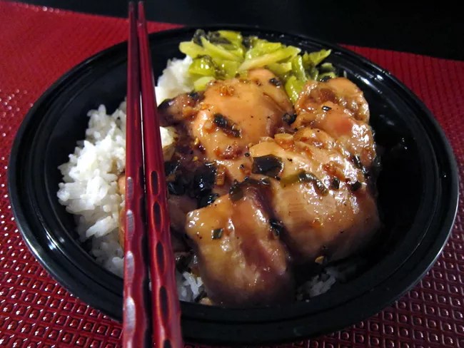I’ve made my own Bento box here … a little rice, a few chicken thighs, and a side of pickled mustard greens: