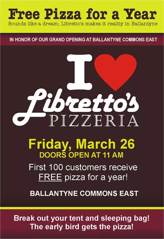 Libretto’s Pizzaria is opening their Ballantyne location on Friday, March 26. In celebration, they will be giving away free pizza for a year at their grand opening.