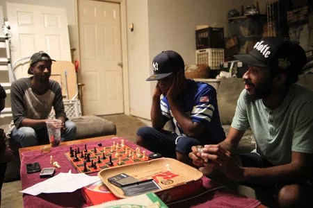 Ry works odd jobs, but a lot of his time is spent with the FC crew. He and a friend pass around a vaporizer while focusing on a game of chess in the garage. “You want to have a return on your investment and see something come to fruition,” he says of Miss Amy’s support of the guys. “If [music] is the only thing you’re doing, you want to see something come from it … but you have to persevere and stay in it for the long haul. It doesn’t happen overnight.”