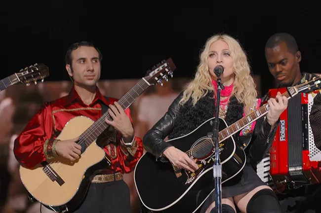 On this stop, Madonna, cradling a black custom Gibson Hummingbird acoustic guitar and flanked by the Kolpakovs, raised a thorny issue with the audience: racism.
