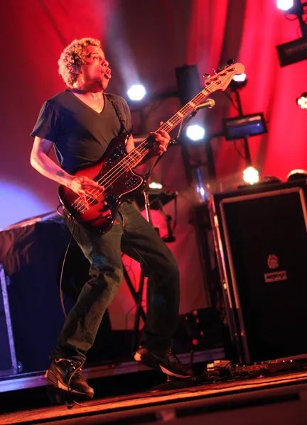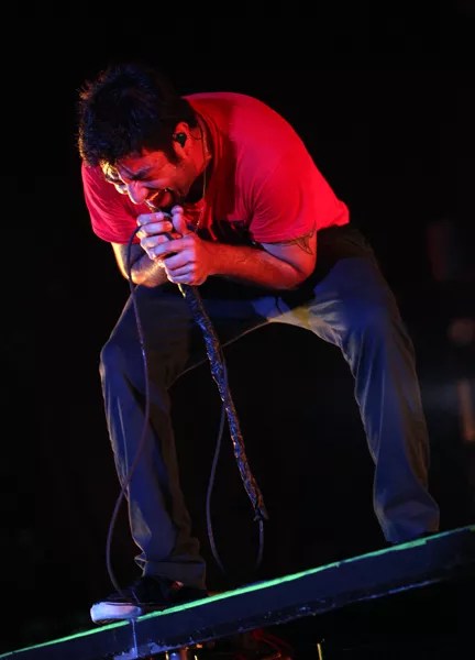 Singer Chino Moreno could rarely stand still, running up and down a ramp in the front of the stage and making his way to both sides and the back of the stage as well. The band had a large backdrop behind them showing a variety of movies, from Japanese horror films to more abstract traffic scenes and space launches.