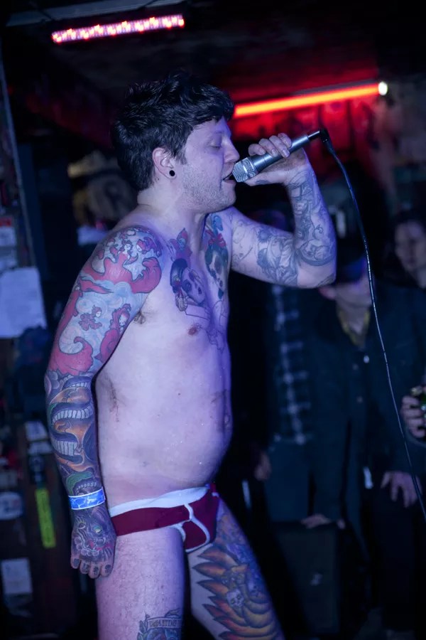Atlanta-based Hawks was up next. Vocalist Michael Keenan Jr. was about as intense as they get shedding most of his clothes only a few songs in after the crowd tried pulling them off. He taunted them saying not to do it half-assed before shedding them himself, leaving a maroon pair of briefs on, his ass hanging out, dirt and mud slathered on his back. He often jumped into the crowd, pinched faces (mine included) and did his best to get every person in the room involved.