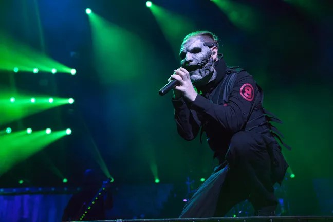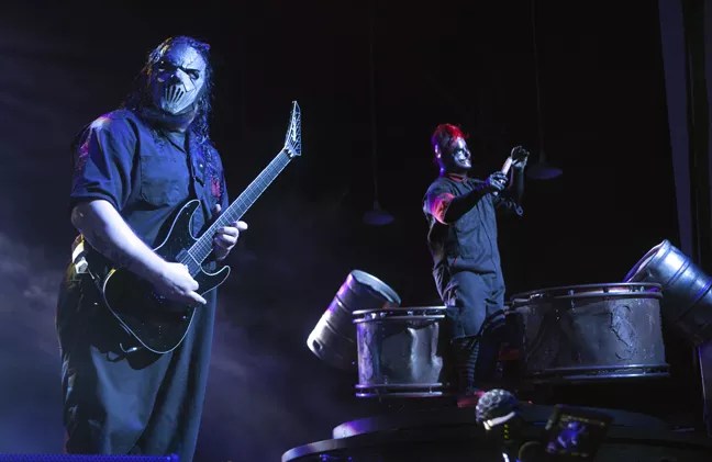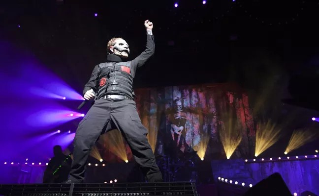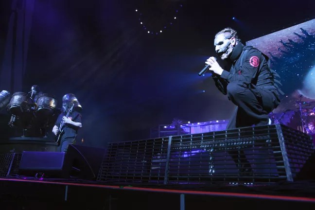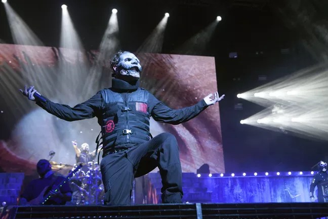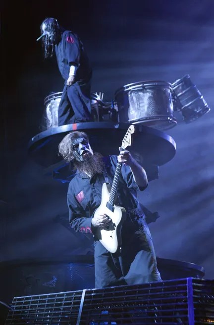 While the band appeared to be a bit toned down โ no clowns hanging from the spinning drum kits, Taylor’s neck brace from recent spinal surgery kept his movements limited โ sonically, they were as strong as ever.