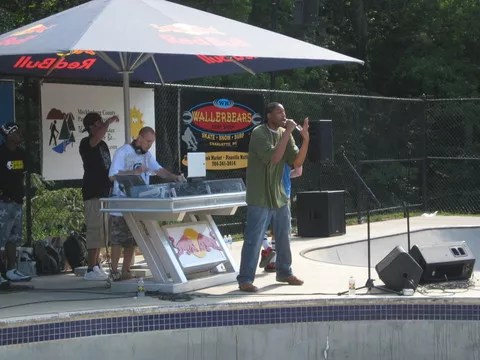 I was an uncomfortably hot Saturday afternoon and I found myself running down a half pipe in platforms sandals dodging little kids skating by and trying hard not to bust my ass on the concrete. It was like a random parade in this skate boarding rink. Skaters of all ages, spectators of all ethnicities, bad asses, Charlotte Roller Girls … and breakdancers. On concrete? I imagined that hurt a little.