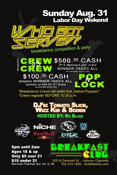Speaking of break dancing annual events this Sunday is the Breakfast Clubs annual Who Got Served Labor Day weekend Breakdance competition and party.