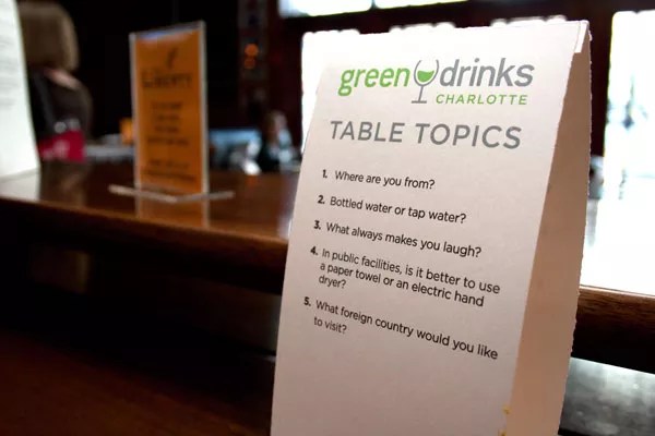 Learn more at GreenDrinksCLT.com or via your social-media site of choice; the group’s on Twitter (@GreenDrinksCLT), Facebook and LinkedIn.