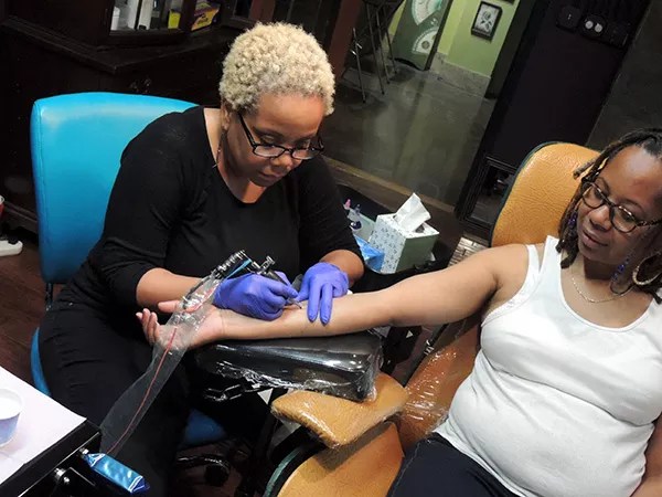 Moran tattoos Alli Plyler. Credit: Melissa McHugh