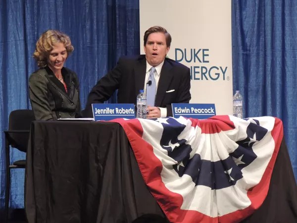 Republican candidate Edwin Peacock III tossed the latest barb during the Charlotte Observer/WBTV debate at Spirit Square on Oct. 21. He drug her into the mud in the nicest way possible about her record on education, crime and the botched real estate reappraisal while she led the Commission. His golden quiff bobbed as he said the two were different, seeming to be conciliatory and putting down his handful of mud. But it was merely a prologue to smooshing it into her hair. Roberts kept her hands poised on the desk. She wasn’t going to let him dirty her sensible gray suit jack today. Nor ever.