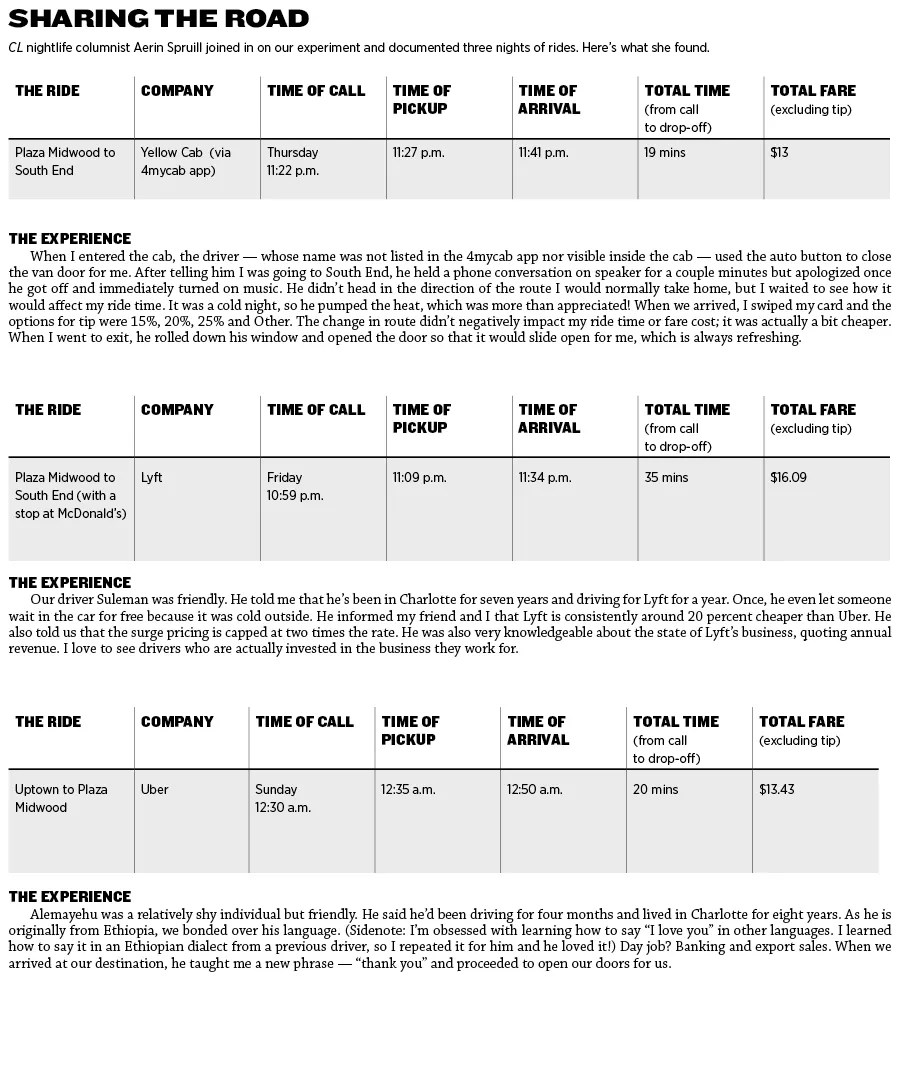 Because of the growing popularity of rideshares, we took to the streets to get a clearer idea of what Uber, Lyft and Yellow Cab have to offer. We selected these three companies based on a couple of key similarities: they all have their own apps designed to make their service user-friendly and, by our unofficial research, they’re the most popular ways to get around on an alcohol-filled night in Charlotte. For our experiment, we examined varying factors, including price, time, distance and overall experience, among other things.