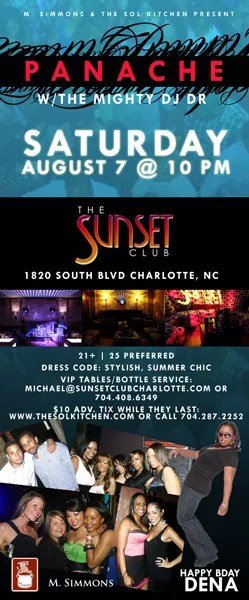 Panache w/The Mighty DJ DR (Voted Best Club/Party DJ in Charlotte by Creative Loafing) at The Sunset Club.