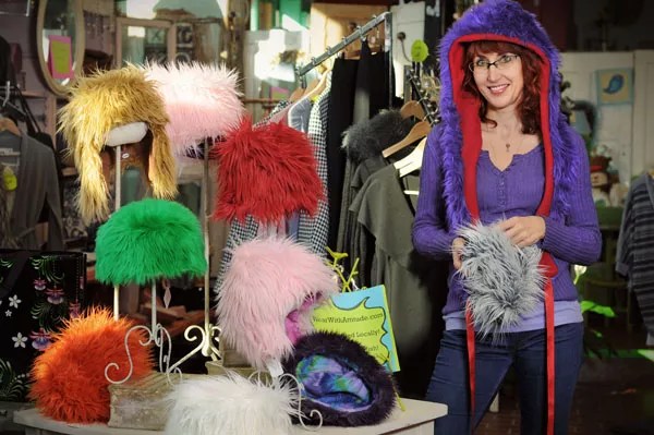 Grasty is the designer and maker of a hat line called Wear With Attitude. (In addition to being sold via her website and Etsy, she also has a display at Green With Envy, 1111 Central Ave.) Available in a variety of colors (from hot pink to blond) and designs (the Cozy Mo, for example, sport fur going down the center of the hat, resembling a Mohawk) for men and women, each hat is made of faux fur and lined inside with warm fleece. It’s not only a fashion statement, but during these winter months, it truly serves a function.